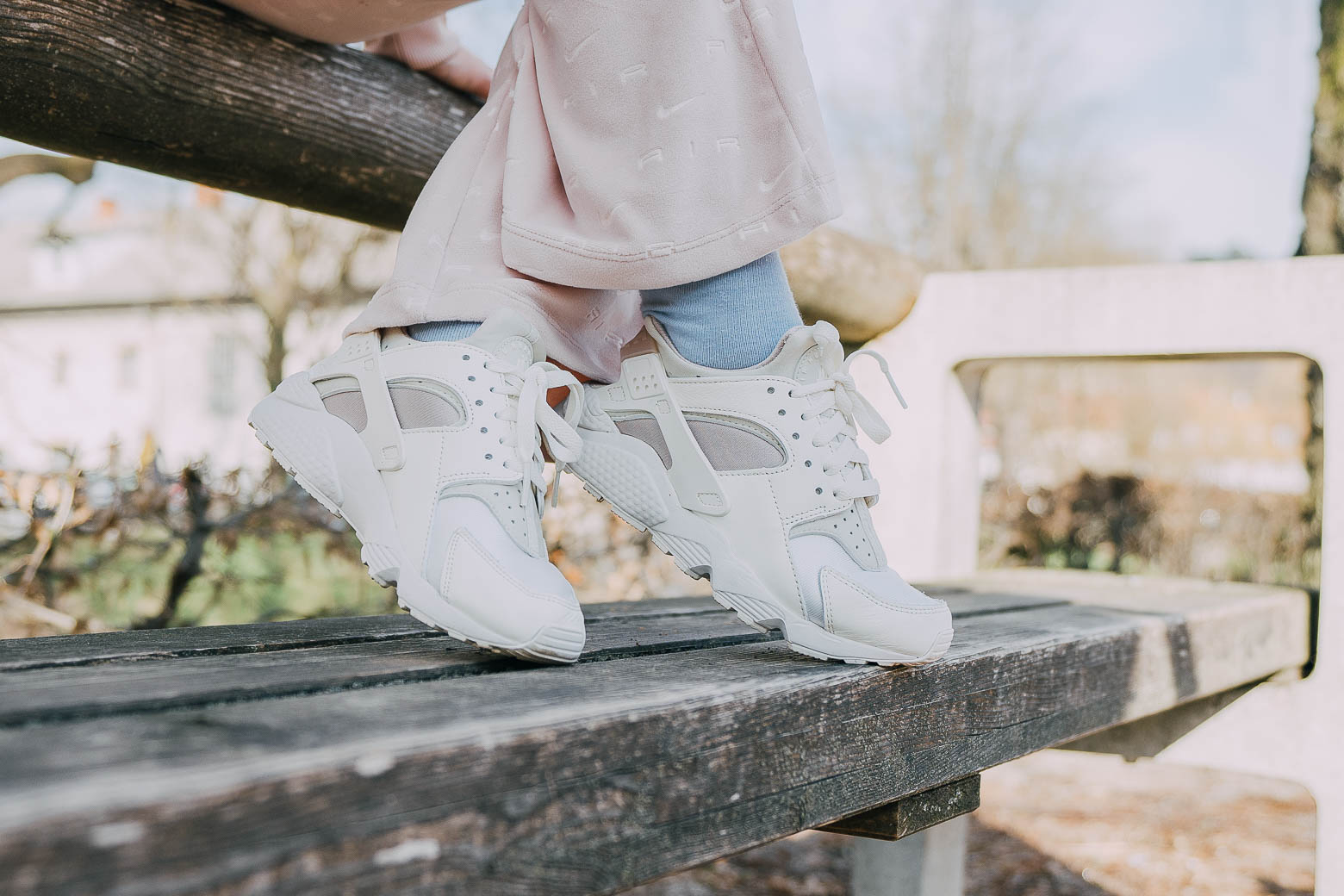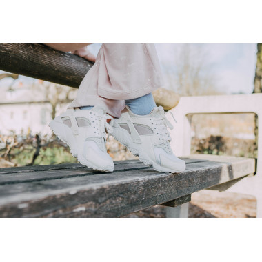 И покрај тоа што патиката е дизајнирана како спортски модел, Nike Huarache е одлична и за комбинирање со модерни парчиња. Го избрав Nike Huarache во комбинација на бели и нежно розови бои, кои ги комбинирав со пролетен аутфит во истите бои. Комплетот се состои од matchy долен дел и јакна изработена од удобен и мек велур кој ве загрева и во студените пролетни утра. Целиот сет се издвојува со врежана Nike Air графика која се протега низ целата должина.