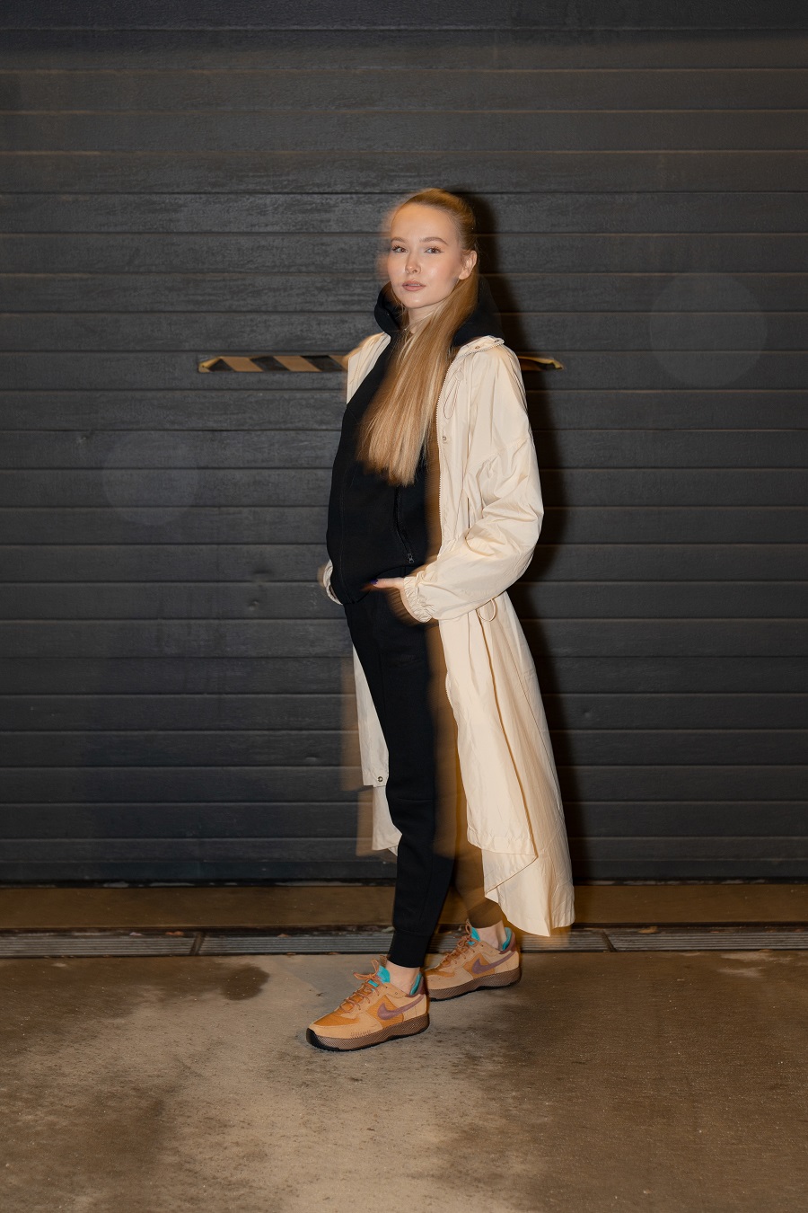 Ги споив со Nike Tech Fleece црна тренерка: Неутрална основа која им овозможува на патиките да бидат во центарот на вниманието. Нејзината елегантна, но лежерна форма совршено го надополнува грубиот дизајн на патиките, додека јакната Nike Sportswear Essential додава допир на целиот аутфит. Нејзината едноставност служи како контраст на впечатливите детали на патиките, обезбедувајќи хармоничен и модерен изглед.