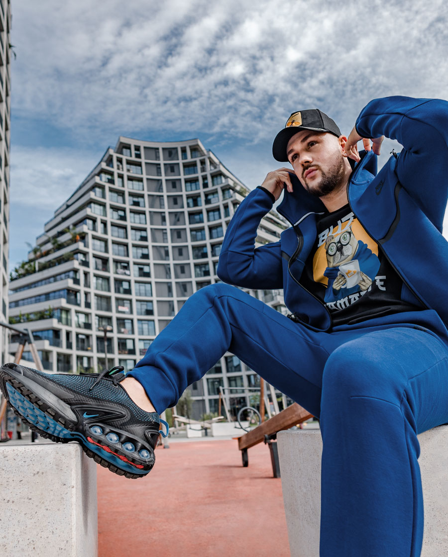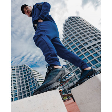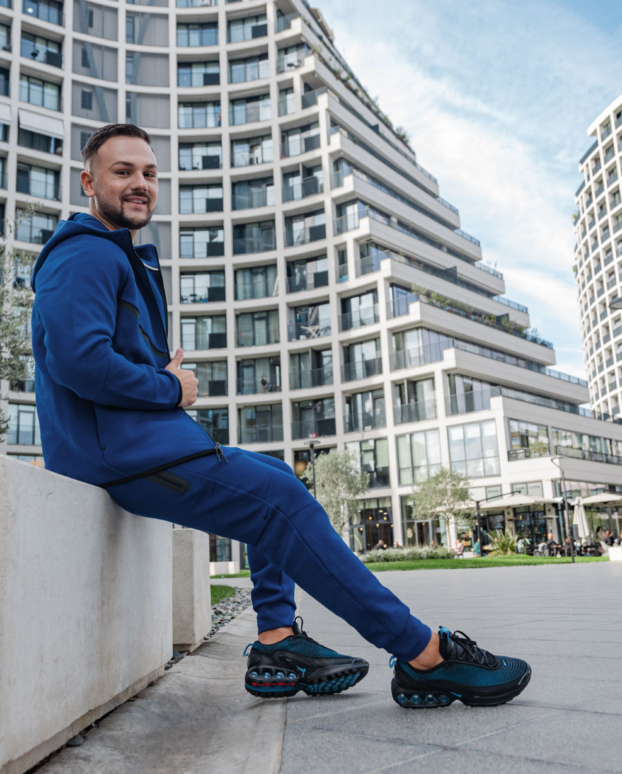 Она што веднаш ме привлече е чистиот, но модерен дизајн — комбинација од црна и темно сина боја, микс што се издвојува без да биде претеран. Тоа е стил кој функционира без напор — само ги облекуваш и знаеш дека изгледаш совршено. За да го комплетирам изгледот, го одбрав Nike Tech Fleece дуксерот во сина боја, кој не само што совршено се вклопува со патиките, туку ми овозможува и целосна слобода на движење без ограничувања.